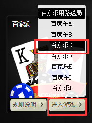 找到百家乐图标,把鼠标移动至【进入游戏】,系统会弹出百家乐的用路选局菜单,单击用路。
