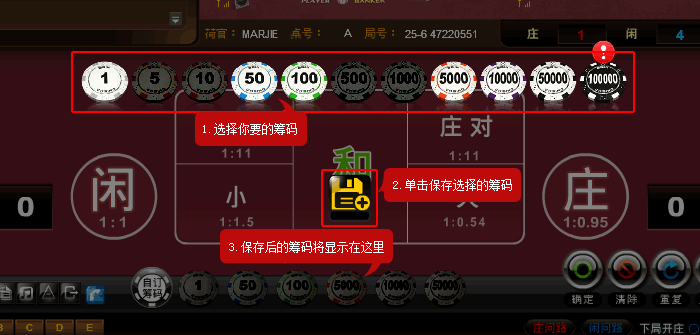 等游戏加载完成后,点击【筹码】,按图片中的步骤来设定你要使用的筹码,最后点击【保存】图标来保存设定好的筹码。
